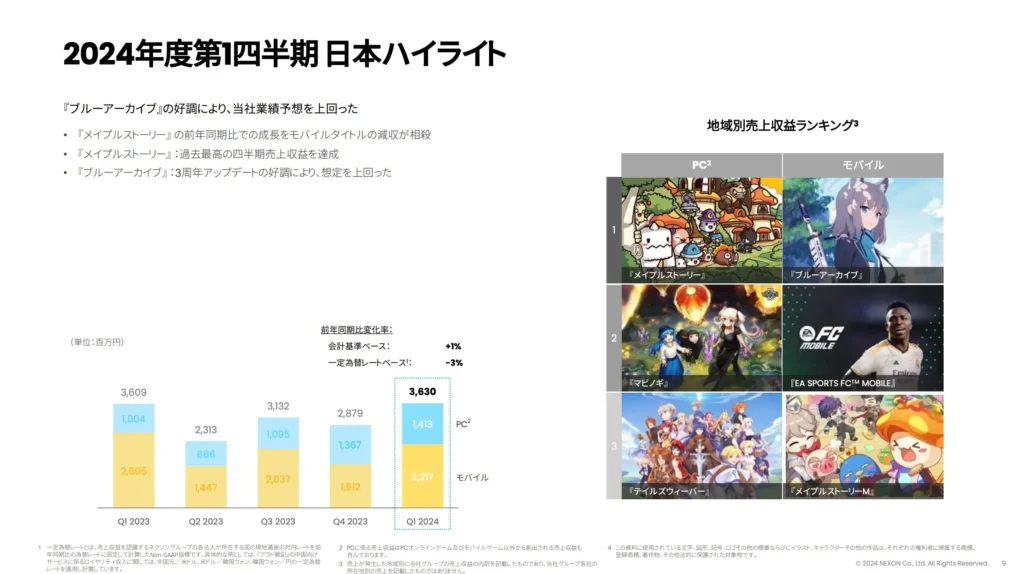 ネクソンのIR資料を見ると、『テイルズウィーバー』は2024年度第1四半期のPC部門売上ランキングで3位に位置づけられていました。しかし、それ以降の四半期資料ではトップ3から外れており、安定して上位に入っているとは言いにくい状況です。ただし、IR資料内では不定期ながら名前が登場しており、一定規模の売上を継続的に出しているタイトルであることは読み取れます。