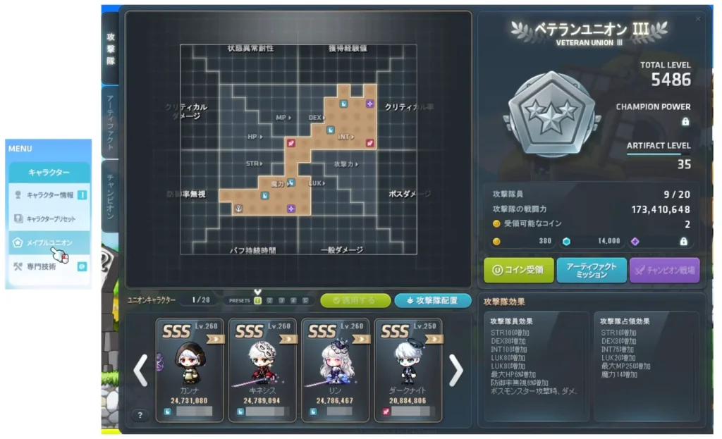 メイプルストーリー公式から引用 育てたキャラのレベル合計をもとに、盤面にキャラを配置してステータスを強化するシステムです。