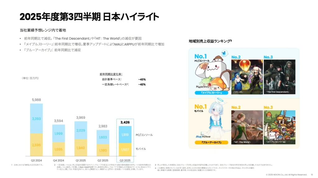 メイプルストーリーがPC/コンソール部門で1位になっています。十年以上メイプルストーリーは首位の座を獲得しており、ネクソンジャパンの中ではパソコン向けのゲームではメイプルが1番売り上げていますので、なかなかサービス終了は考えにくいです。