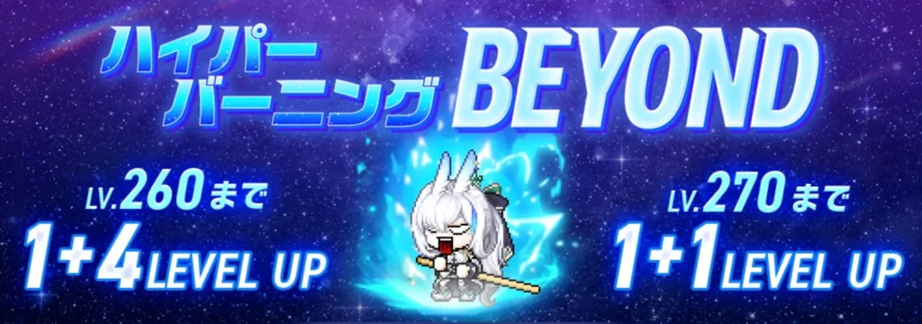 新職業「レン」の実装に伴い、始まったハイパーバーニングBEYONDです。ハイパーバーニングに指定したキャラクターは200レベルまでテラブリングでものの十数分で200レベルになり、260レベルまでは5レベル毎にレベルが上がり、270までは2レベル毎に上がっていきます。毎日デイリークエストやモンスターパーク、そしていちご農場やEXPクーポンなどを使えば1ヶ月もしないうちに270レベルになります。