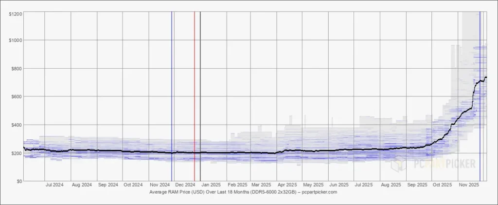 上記のグラフはDDR5-6000 2x32GBの64GBですが、2025年10月を境にだんだん値上がっており、12月では9月の約3倍にまで値上がりしています。