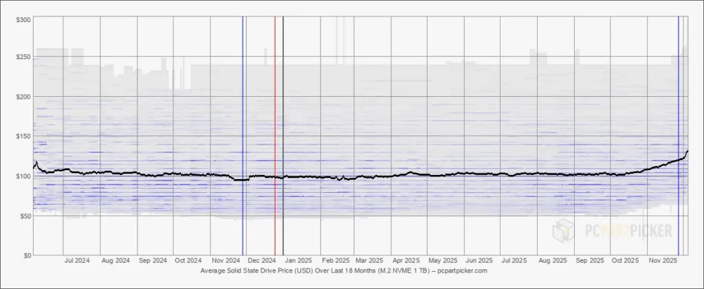 メモリとストレージの価格推移はpcpartpickerのサイトを確認すると以下ように値上がりが顕著に見て取れます。