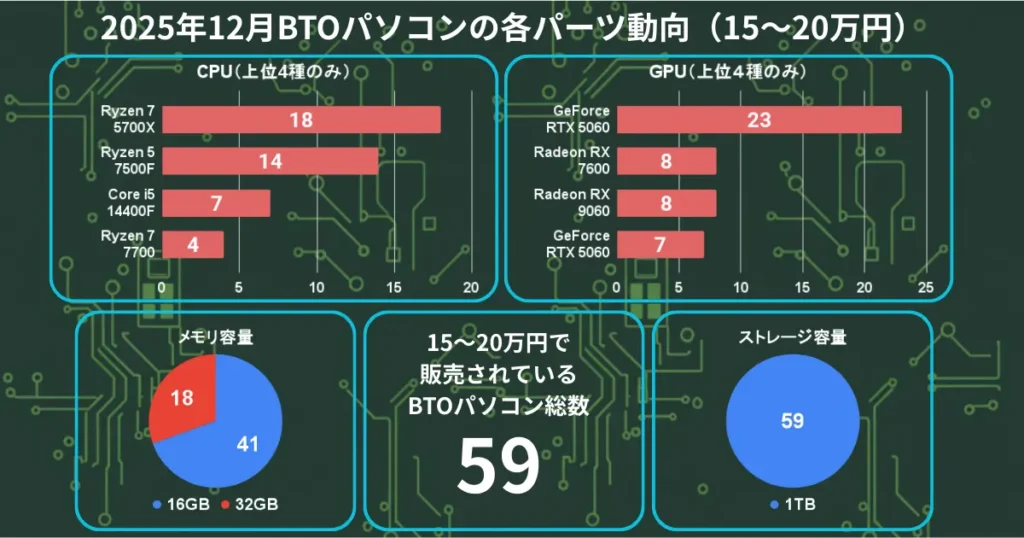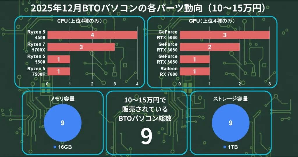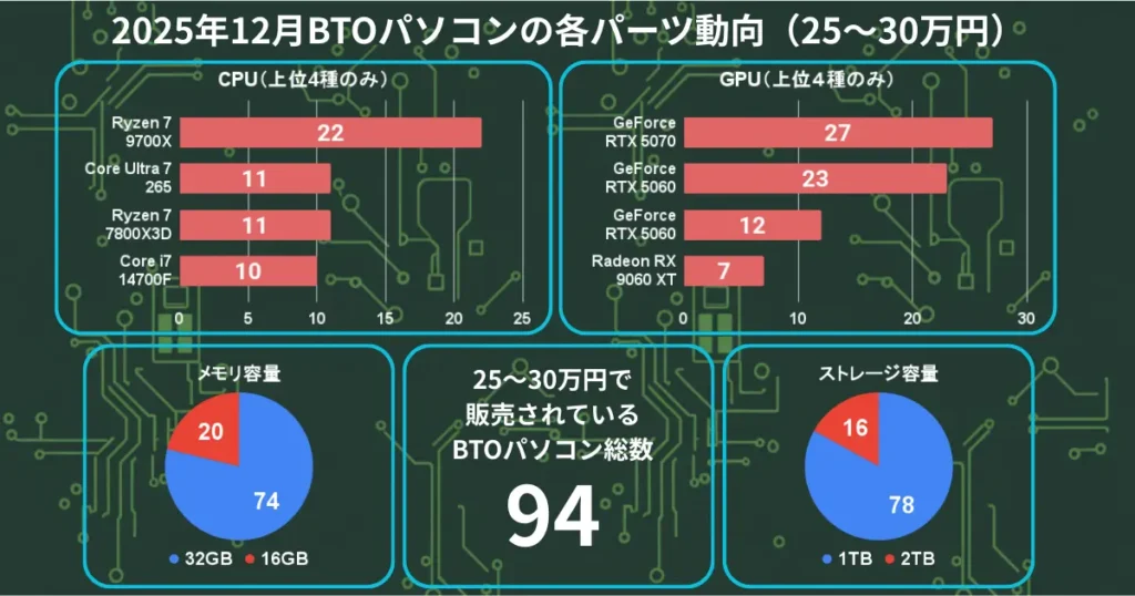 それでは2025年12月の各価格帯のBTOパソコンのパーツ動向を見てきましょう。