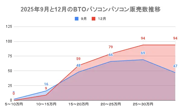BTOパソコン全体の価格にも影響しており、以下に示す値上がり前の9月と今月の12月のBTOパソコンの販売推移を見ても、15万円以下のパソコンの販売数が減り、15万円以上のパソコンが増えているのがわかります。